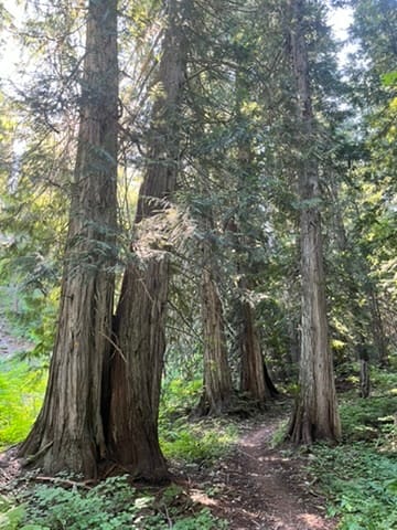 The trail runs through immense cedar trees. They’re so solidly rooted and so tall that my neck starts cramping from looking up. I try to take photos quickly, but the moment you stand still, you’re attacked by mosquitoes. You have to keep moving, or the itching will drive you crazy.