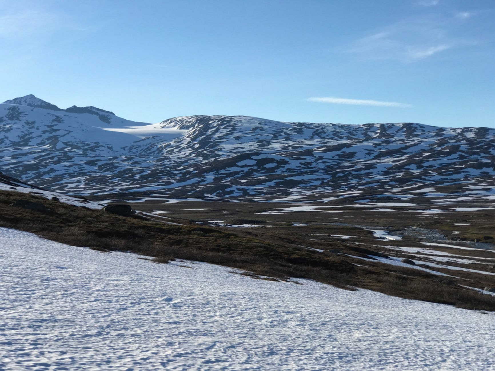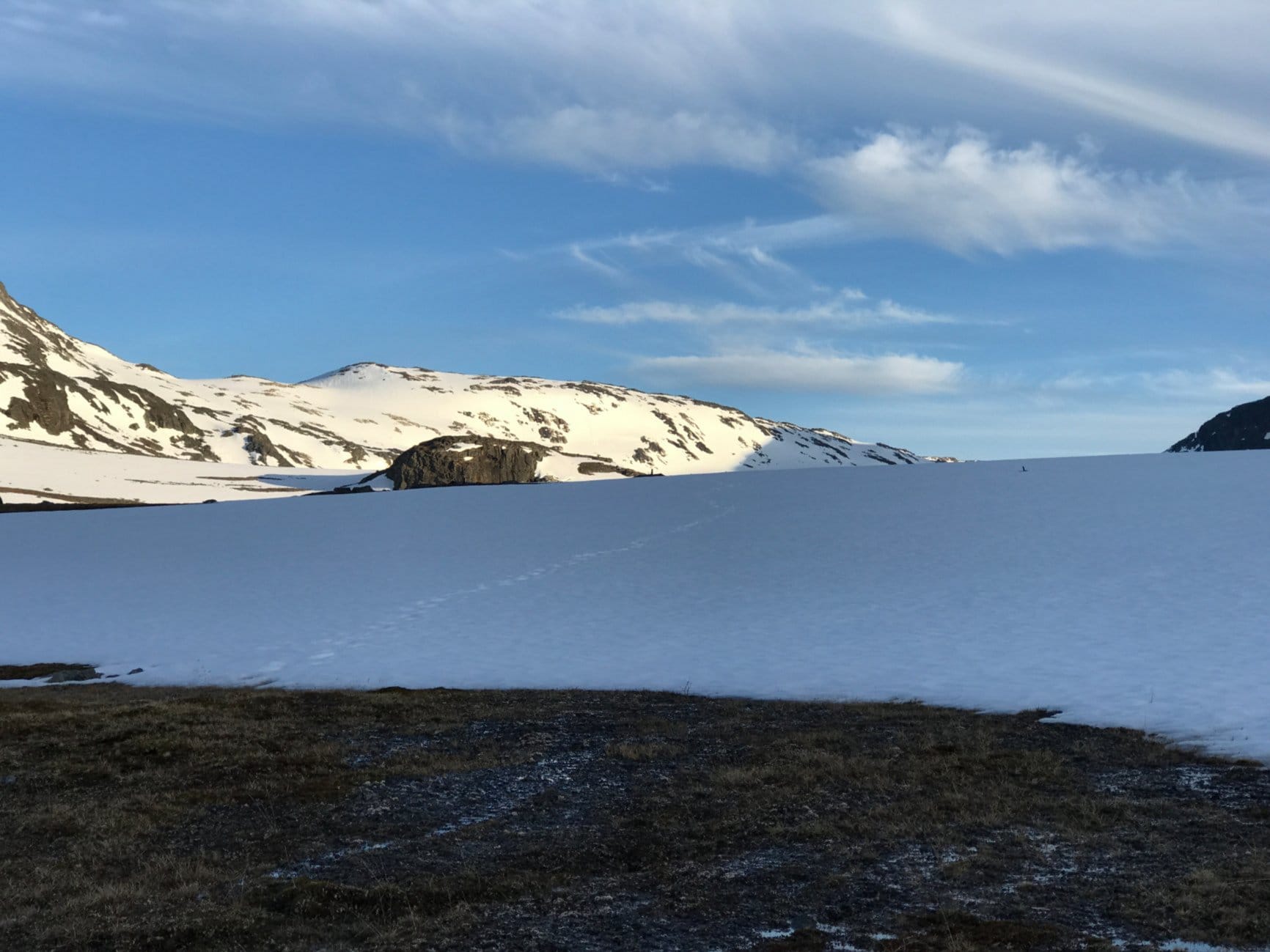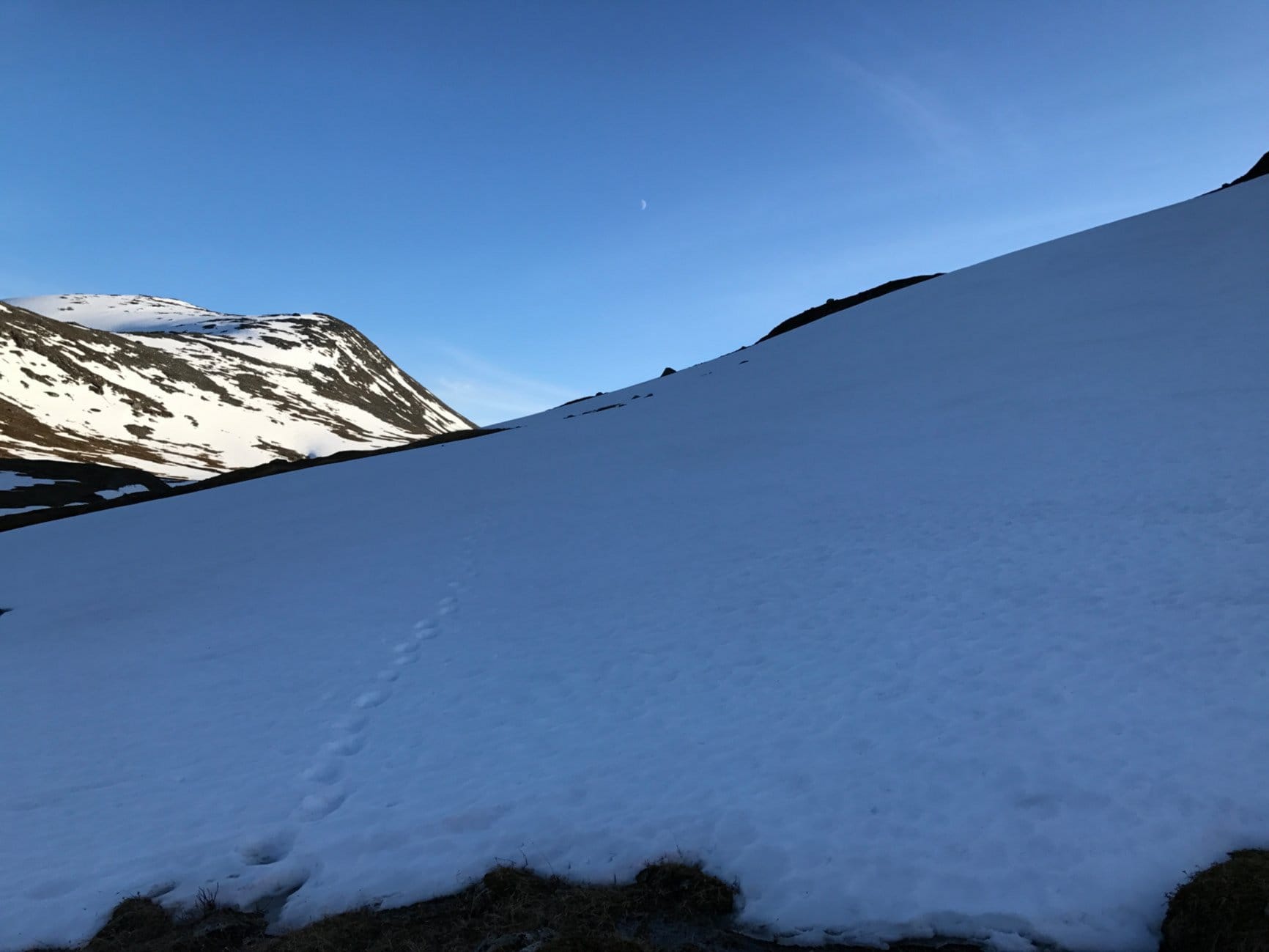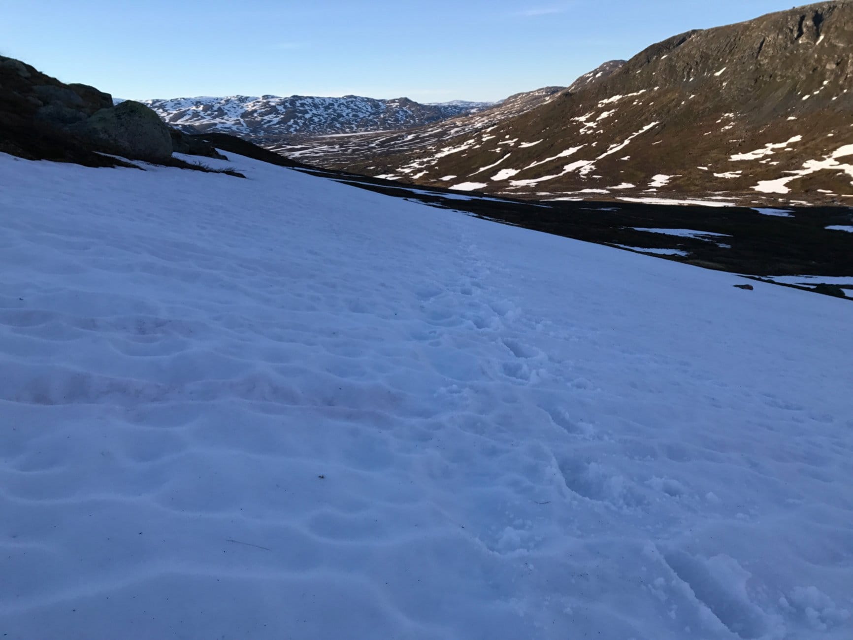 The snowfields are getting more intense. It’s quite icy, but I still sink about 20 cm. At some point the VBL liners give up and start leaking too. Cold feet set in.