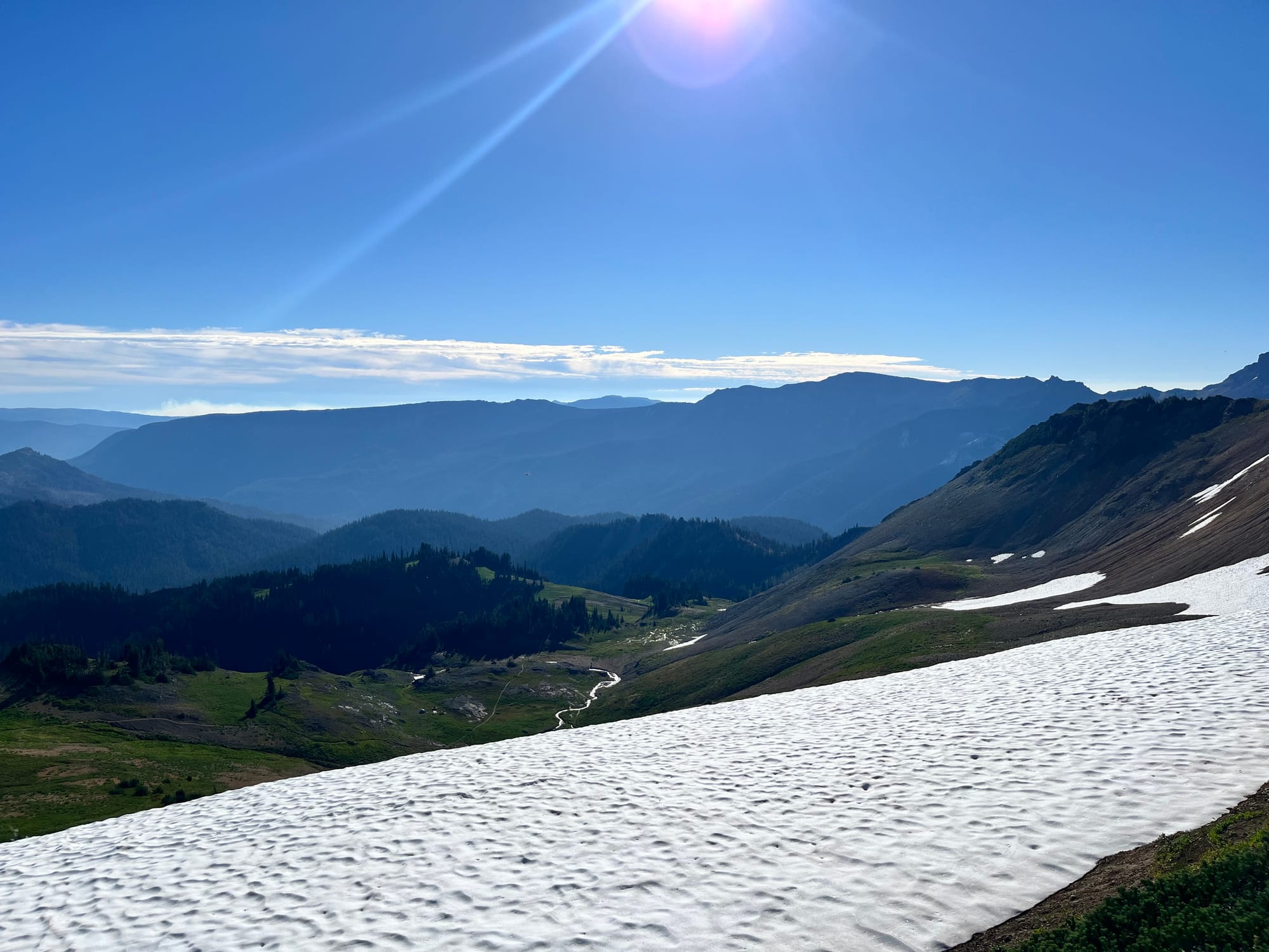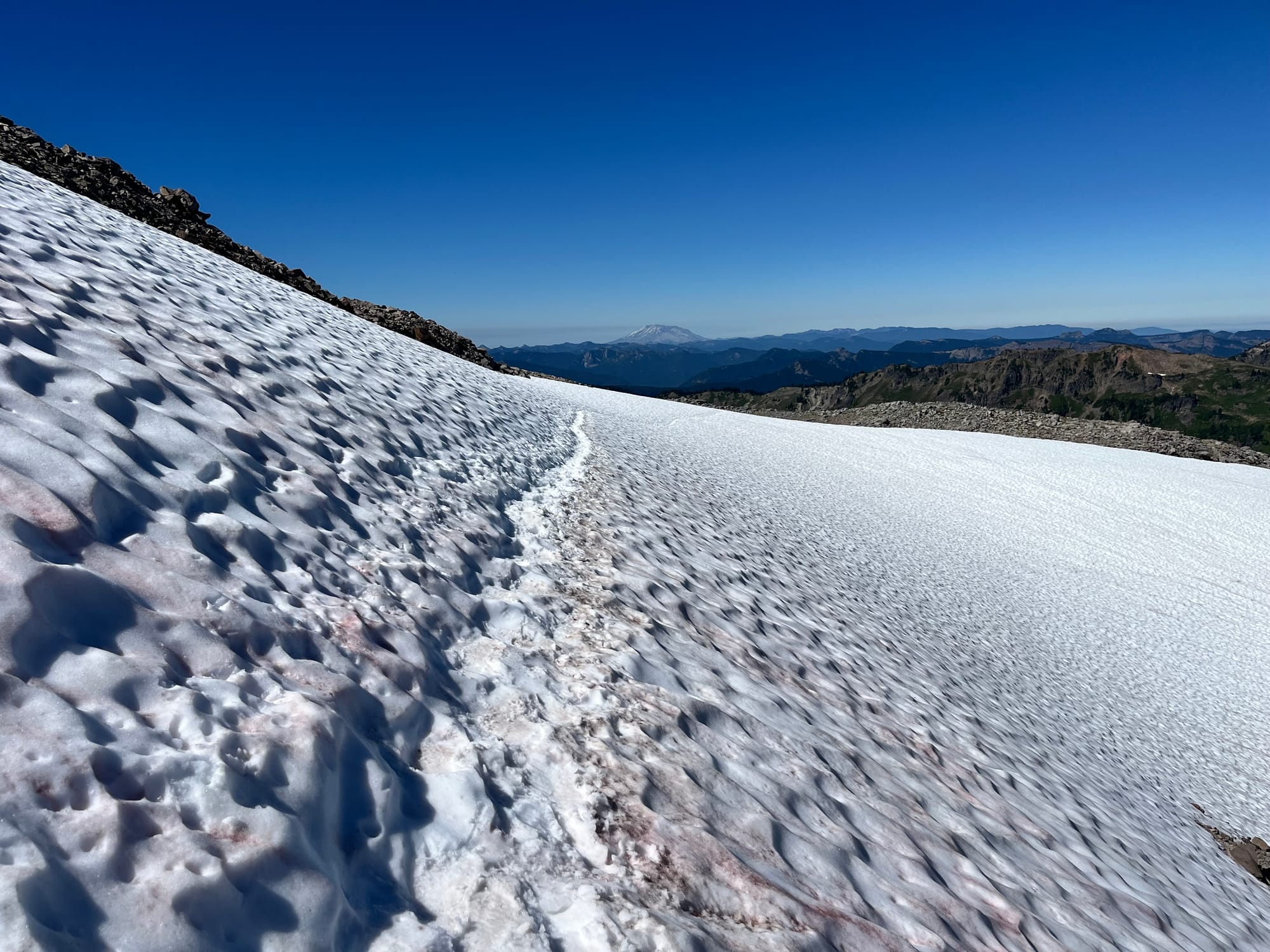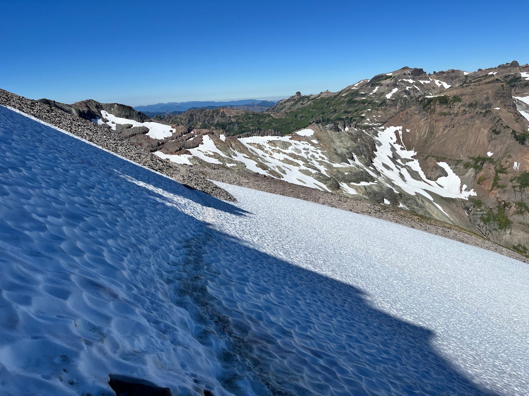 Uh oh, this snowfield lies in the shadow of the mountain, making it a bit icy. Once again, I’ve sent my microspikes ahead because I thought I wouldn’t need them.